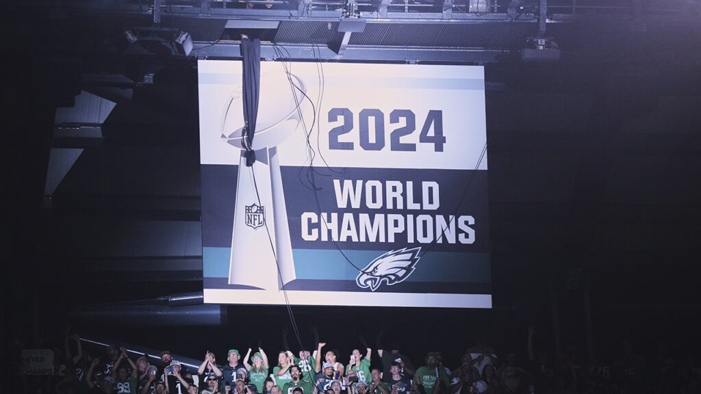The Philadelphia Eagles 2024 championship banner is unveiled before an NFL football game against the Dallas Cowboys Thursday, Sept. 4, 2025, in Philadelphia. (AP Photo/Matt Slocum)